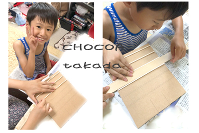 貼り付けた細い木と細い木の間にまた違う木を通したいので慎重に作業